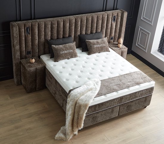 De complete boxspring Sheraton is voorzien van een boxspring, groot hoofdbord, nachtkastjes, ingebouwde USB-aansluiting, verlichting en opbergruimte.