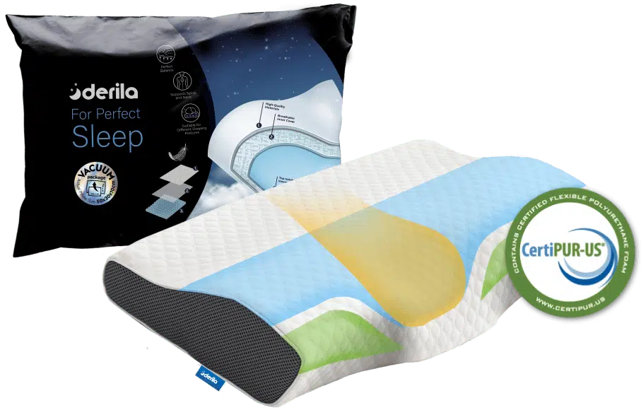 Het Derila kussen heeft een bijzondere vorm, het kussen heeft namelijk een wigvorm waardoor de nek, voornamelijk voor rugslapers veel beter ondersteund wordt. De vulling is traagschuim. Om luchtcirculatie te bevorderen zijn de zijkanten van gaas. Het tijk is van polyester en dus wasbaar. Het kussen is 30x50cm en daarmee een stuk compacter dan andere kussens. Dit kan in het begin wennen zijn. Het kussen is dunner dan andere kussens, hierdoor is het het best geschikt voor rugslapers.