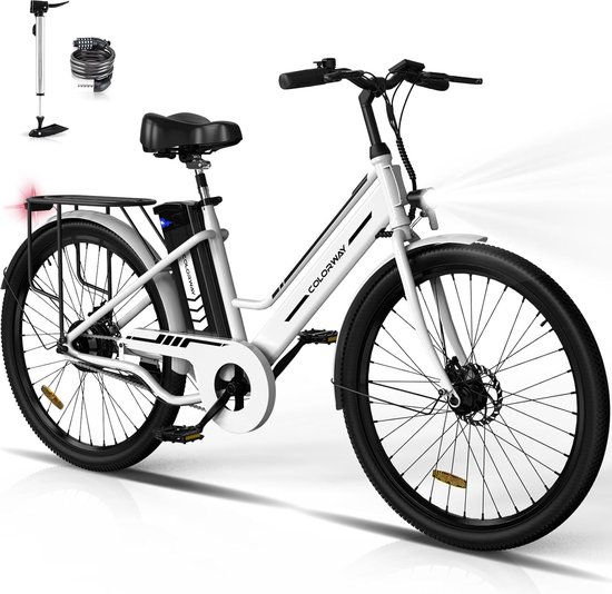 Voor extra comfort en veiligheid is de Hitway BK6 uitgerust met schokdempers in de voorvork, een ergonomisch zadel met dubbele laag en schijfremmen voor en achter. De stevige constructie van roestvrij aluminium legering zorgt voor duurzaamheid en stabiliteit, terwijl de geïntegreerde koplamp, achterlicht en reflectoren zorgen voor zichtbaarheid in het donker.