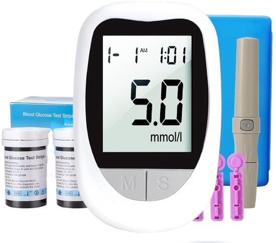 - Inclusief teststrips, lancetten, batterijen en opbergtas