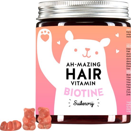 De Bears with Benefits van Ah-Mazing zijn vitamines voor je haar in de vorm van gummies. De gummies bevatten een hoge dosering biotine, een vitamine die bijdraagt aan de instandhouding van gezond haar en een gezonde huid. Daarnaast bevat deze haarvitamine foliumzuur, zink, jodium en de vitamines A, C, E en B6. De gummies hebben een natuurlijk aroma van framboos en bosvruchten en zijn vrij onnodige toevoegingen. De gummies zijn suikervrij en zijn gezoet met de natuurlijke zoetstof Stevia. Je neemt dagelijks één van de gummies in.