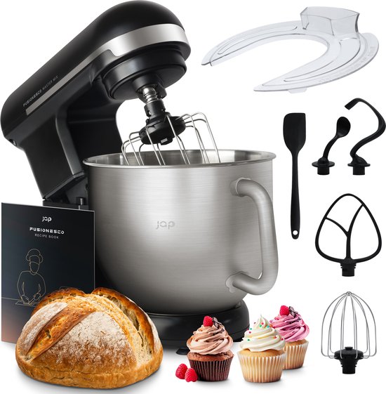 De kom is gemaakt van roestvrij staal, waardoor deze stevig aanvoelt en er stijlvol uitziet. Wat ons betreft, is dit een van de mooiste modellen op de markt! Je ontvangt een aantal accessoires, zoals een menghaak, garde en deeghaak. Het apparaat heeft een kantelbare kop, antislip zuignappen aan de onderkant en een handig spatscherm.