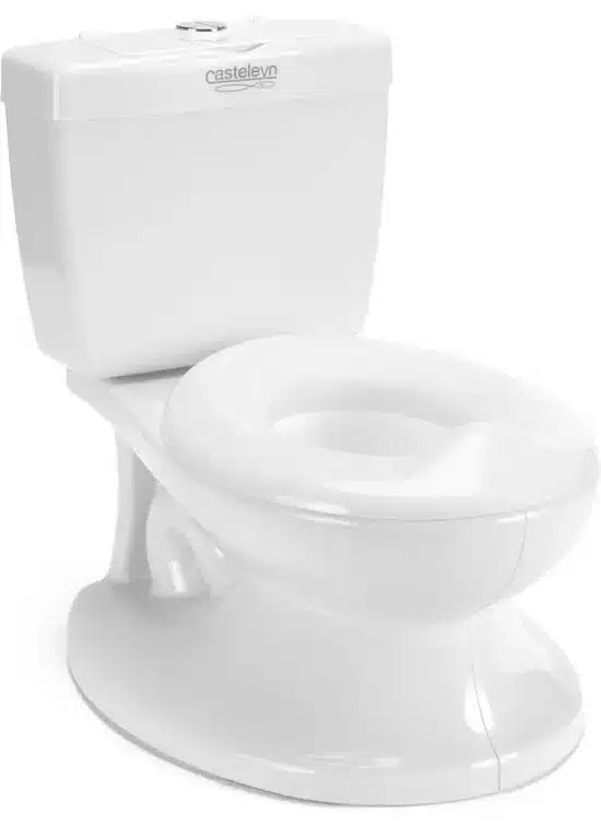 Het plaspotje van Casteleyn is een fantastische manier om je kleintje vertrouwd te maken met het gebruik van het grote mensen toilet. Niet alleen ziet het potje eruit als een echt toilet, maar het klinkt ook zo. Plaats simpelweg de meegeleverde batterijen in het potje en laat je kind op de knop drukken om een doorspoelgeluid te horen, wat de ervaring realistischer maakt. We vinden dit echt een hele leuke feature waarmee je peuters helpt om vertrouwd te raken met het idee van een echt toilet.