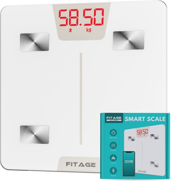 De FITAGE Personenweegschaal is een slimme weegschaal die 17 verschillende lichaamsgegevens meet en via Bluetooth synchroniseert met je smartphone. Bekroond als 'Beste Prijs-kwaliteitverhouding', biedt deze weegschaal een combinatie van nauwkeurigheid, gebruiksgemak en veelzijdigheid. De weegschaal kan je gegevens synchroniseren met Google Health en Apple Health, maar sommige gebruikers melden dat er soms technische problemen optreden. Wat deze weegschaal uniek maakt, is de mogelijkheid om je vooruitgang te volgen via grafieken in de gratis app. Je ontvangt ook een gratis E-Boek over afvallen bij aankoop.