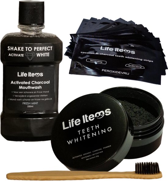 Dit product is een compleet pakket van verschillende producten die helpen om je tanden witter te maken en ook te houden. Zo krijg je bij deze bestelling een bamboe tandenborstel, een potje organische houtskoolpoeder, tandenbleek strips en mondwater.