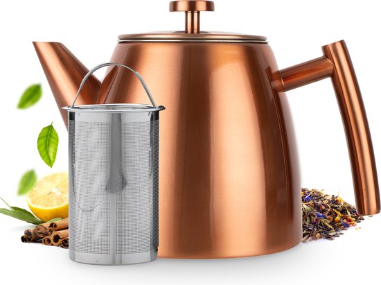 Dankzij de dubbelwandige constructie blijft je thee langer warm, en met het ingebouwde filter kun je ook losse thee gebruiken. De pot heeft een inhoud van 1 liter, drupt niet en voldoet aan moderne eisen. Het opvallende roségouden ontwerp maakt dit model extra bijzonder.