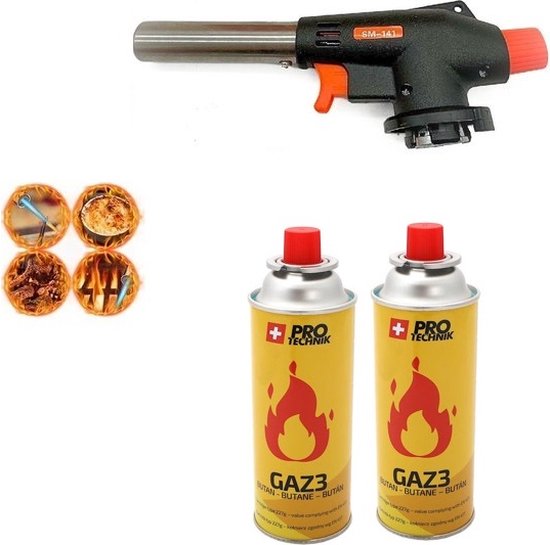 Dit is een complete set, inclusief gasflessen. Bij aankoop van deze set ontvang je een gebruiksvriendelijk opzetstuk en vier gasflessen. De kwaliteit van het opzetstuk is net een slag minder dan van de Gift Land Crème-Brûlée Gasbrander, maar is wel een stukje goedkoper. Verder werkt alles net zo goed. Je klikt het opzetstukje gemakkelijk vast op de gasfles en klikt het er net zo makkelijk weer vanaf om het opzetstukje vervolgens veilig op te bergen. Dit product is ook verkrijgbaar met twee gasflessen.