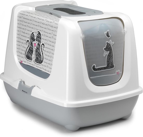 Deze hippe design kattenbak heeft beslist geen ombouw nodig. Aan de voor- en zijkant is deze voorzien van leuke kattenprints. De Moderna is voorzien van een koolfilter en wordt geleverd met een schepje. Door middel van de klemmen aan de zijkant is het onderste gedeelte makkelijk los te maken. Zo krijg je deze design kattenbak eenvoudig schoon. Deze kattenbak is uitgevoerd in wit en grijs met leuke prints en er is ook een versie voor extra grote katten.