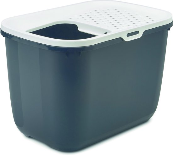 Zoek je een goedkope kattenbak met een mooi design, die goed beoordeeld wordt door tientallen kattenbaasjes? Dan kom je al snel uit bij de Savic Hop in. Op het eerste gezicht een mysterieuze doos met een opening bovenin, maar al snel ontdek je het vernuftige design. Deze kattenbak heeft de opening aan de bovenzijde, waardoor kattengrind er niet uit kan vallen als de poes of kater via de voorkant wegloopt. Bovendien is het grint en daarmee de ontlasting onbereikbaar voor andere dieren en kleine kinderen. Het deksel is afneembaar en aan de zijkant zit een haakje om het schepje aan te hangen.