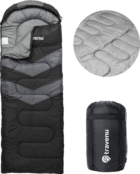 Deze 4-seizoenen slaapzak van Travenu is perfect voor kampeertrips of festivals. De hoogwaardige materialen zorgen voor een lange levensduur, en de slaapzak is waterdicht. De rits glijdt soepel, de pasvorm is verstelbaar met een koord, en klittenband zorgt voor een goede afsluiting.