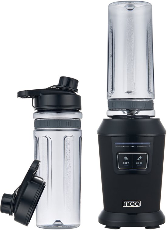 De MOA Mini Blender is niet alleen krachtig, maar valt ook op door zijn stijlvolle ontwerp. Met zijn strakke zwarte afwerking en compacte formaat is deze blender perfect voor wie houdt van zowel functionaliteit als design in de keuken. De twee handige Tritan to-go bekers maken het eenvoudig om je smoothie mee te nemen, waar je ook naartoe gaat.